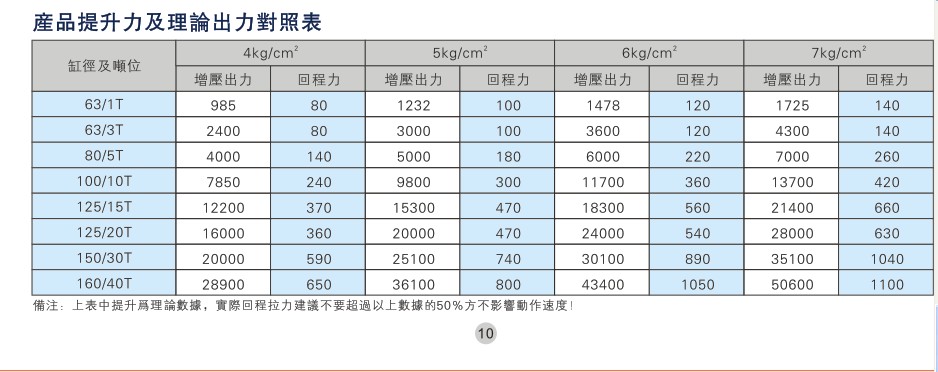 二 產(chǎn)品提升力及理論高壓出力對(duì)照表: