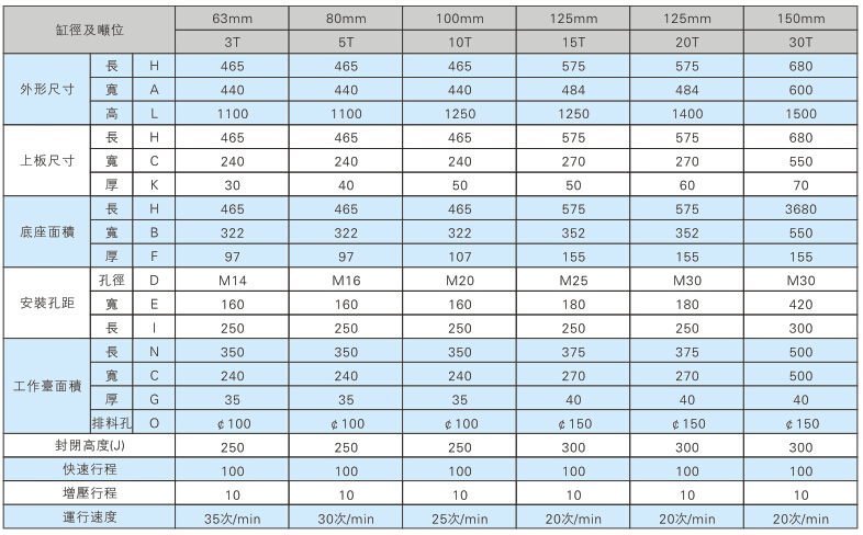 JRI四柱型臺(tái)式增壓機(jī)缸徑及噸位: